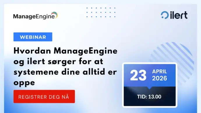 Reduser MTTD og MTTR med en sammenkoblet IT-arbeidsflyt. Bli med ManageEngine og ilert for å se hvordan en enhetlig, AI-drevet tilnærming kobler full-stack-observability med proaktiv hendelseshåndtering.