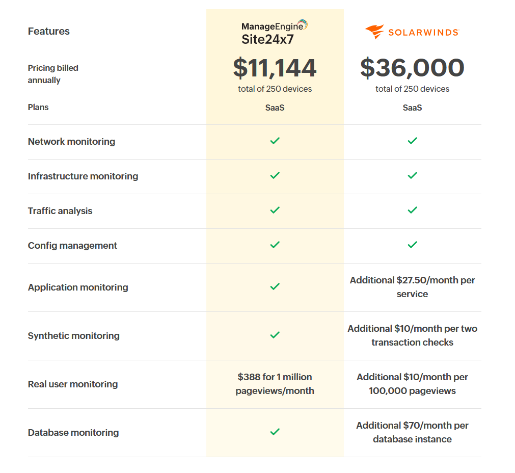 ManageEngine sine SaaS-løsninger er omtrent 70% rimeligere enn SolarWinds Observability SaaS når man sammenligner overvåking av 250 enheter. Dette gir virksomheter en betydelig lavere TCO, samtidig som de får avansert funksjonalitet uten høye månedlige kostnader.